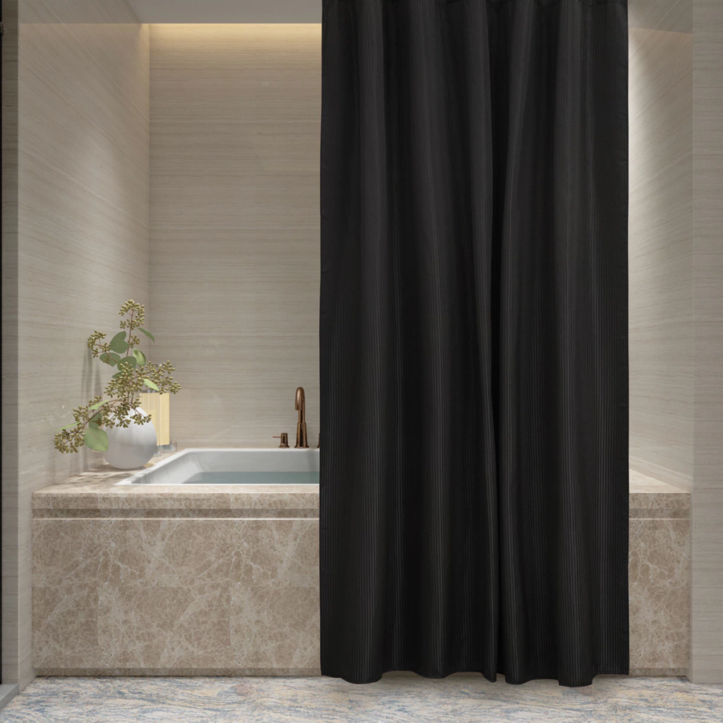 • Cortina de Baño Emboss (180 x 180 cm): Teflonada con estampa emboss, incluye 12 ganchos plásticos y pack de tela. Resistente y de fácil mantenimiento.