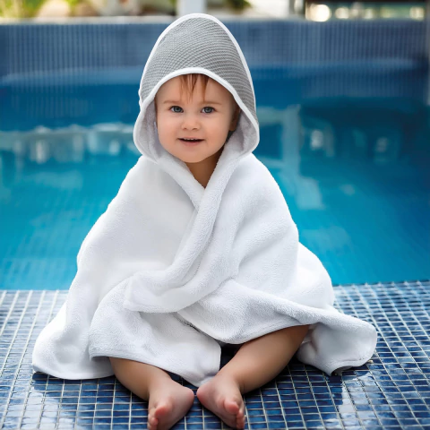 Toallón con capucha en tejido nido de abeja y ribete blanco.
